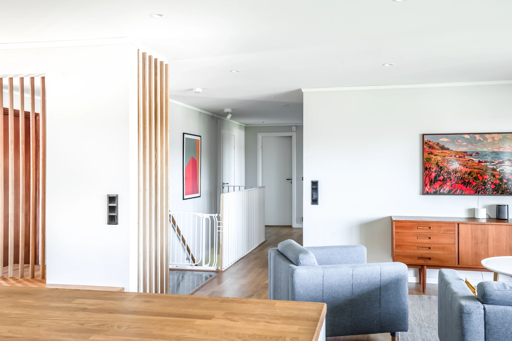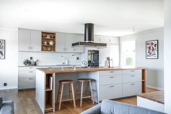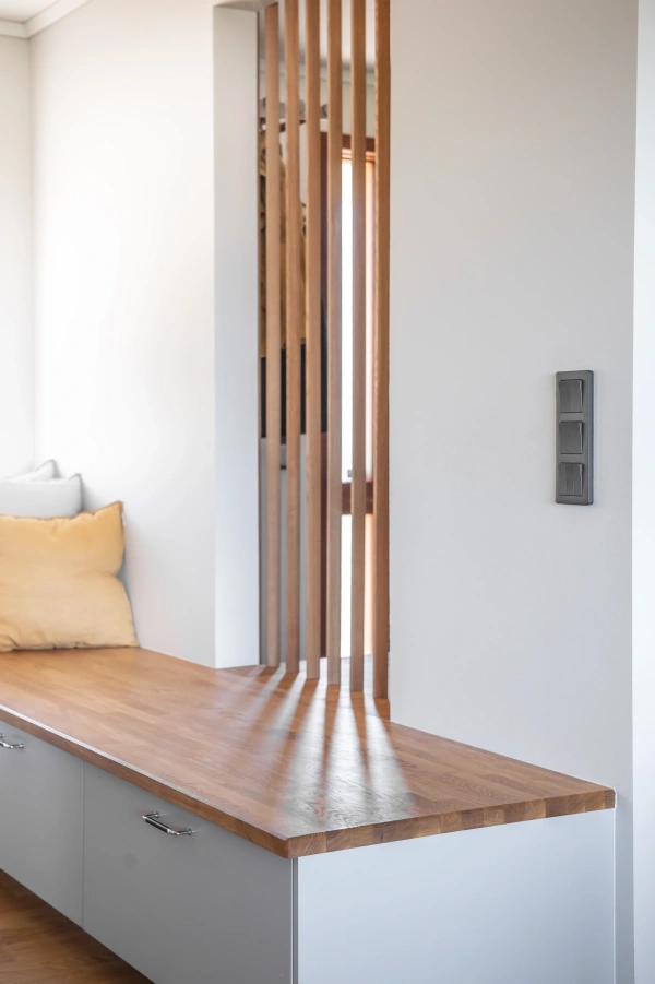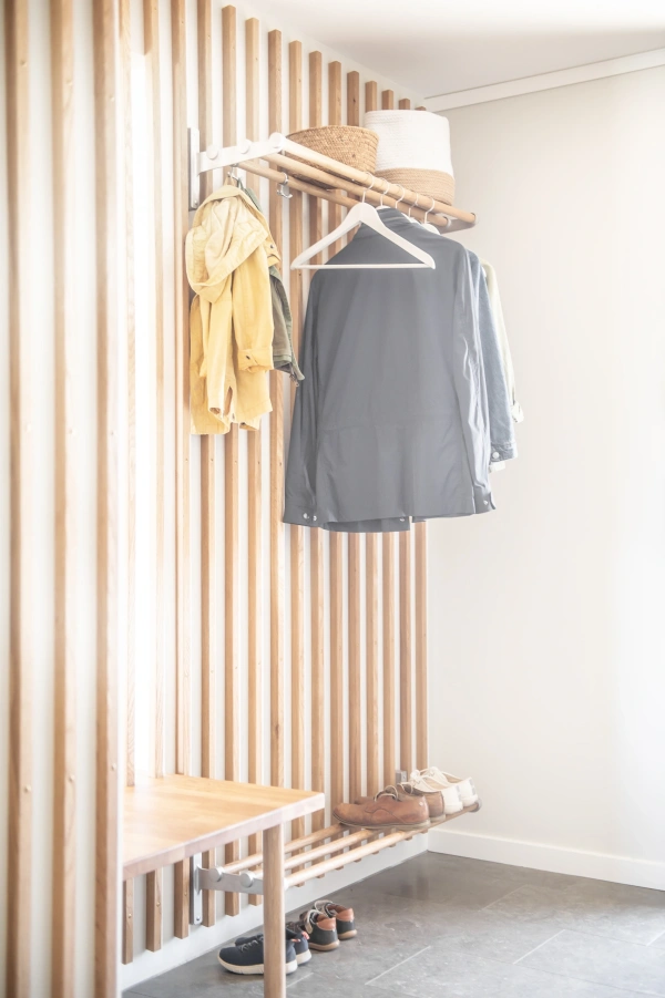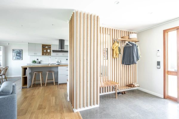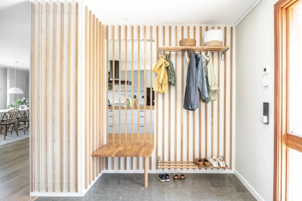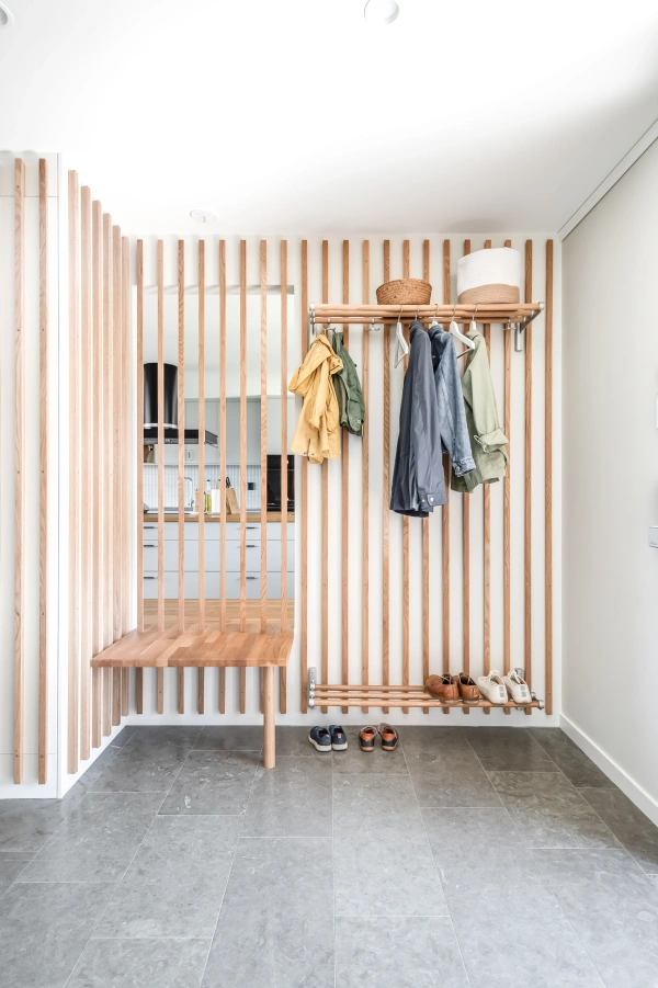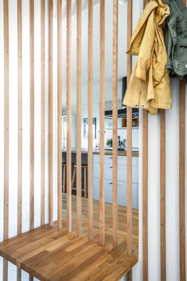 Ekens varma nyanser ramar in rummet och träribborna förenar funktion med estetik. Som en transparent avskärmning låter de ljus och blickar vandra vidare genom rummen, samtidigt som hallen blir en tydlig och naturlig mittpunkt i hemmet. Samspelet mellan kök och vardagsrum är ständigt närvarande, men hallen behåller sin egen identitet.