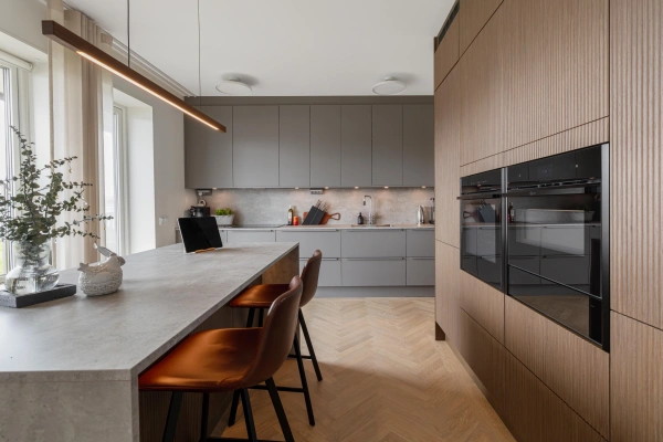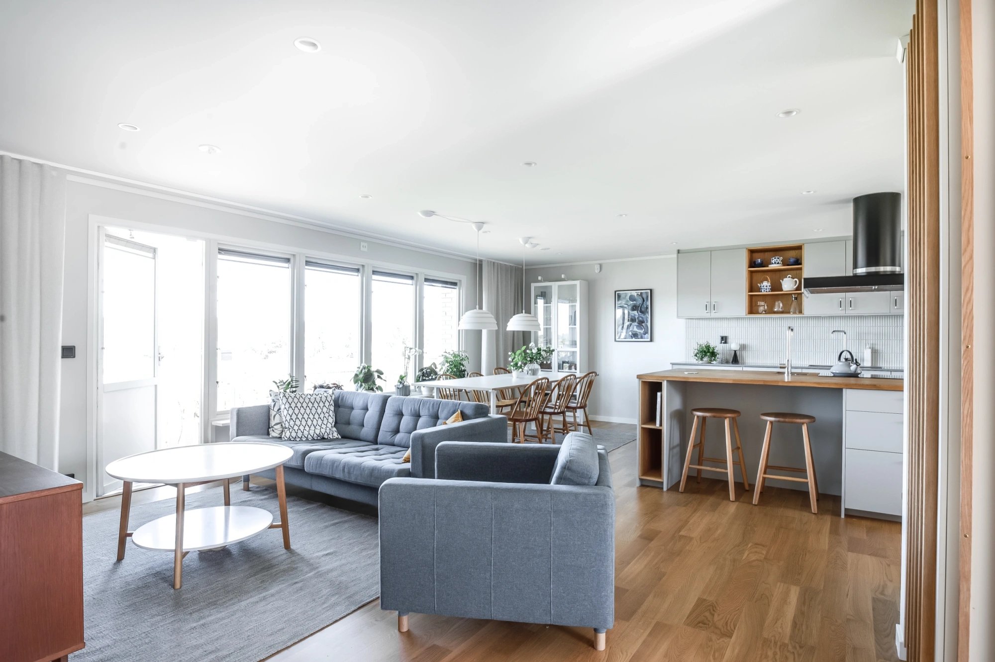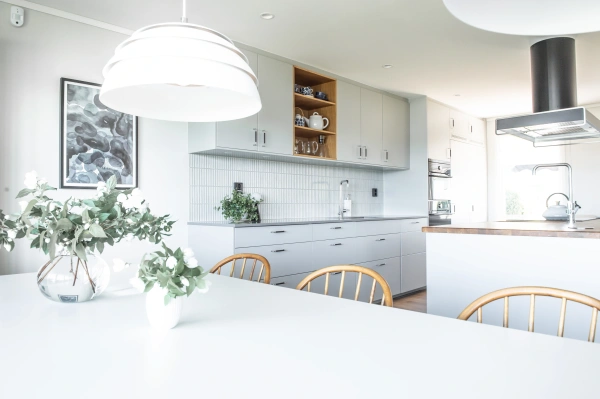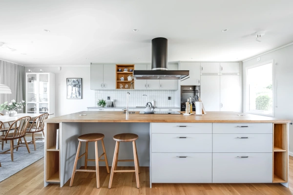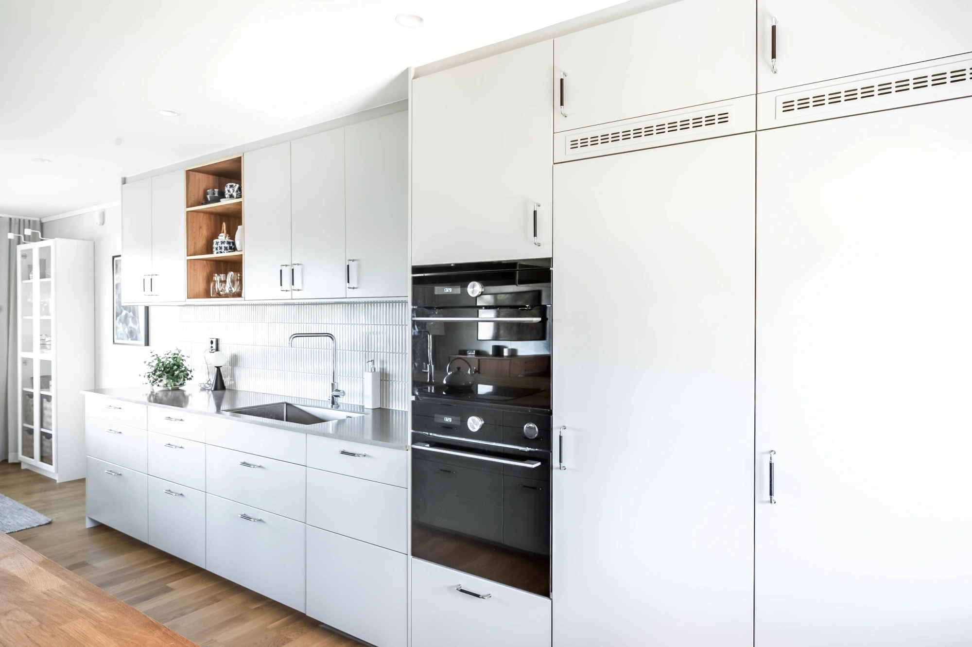 Ekens varma nyanser ramar in rummet och träribborna förenar funktion med estetik. Som en transparent avskärmning låter de ljus och blickar vandra vidare genom rummen, samtidigt som hallen blir en tydlig och naturlig mittpunkt i hemmet. Samspelet mellan kök och vardagsrum är ständigt närvarande, men hallen behåller sin egen identitet.